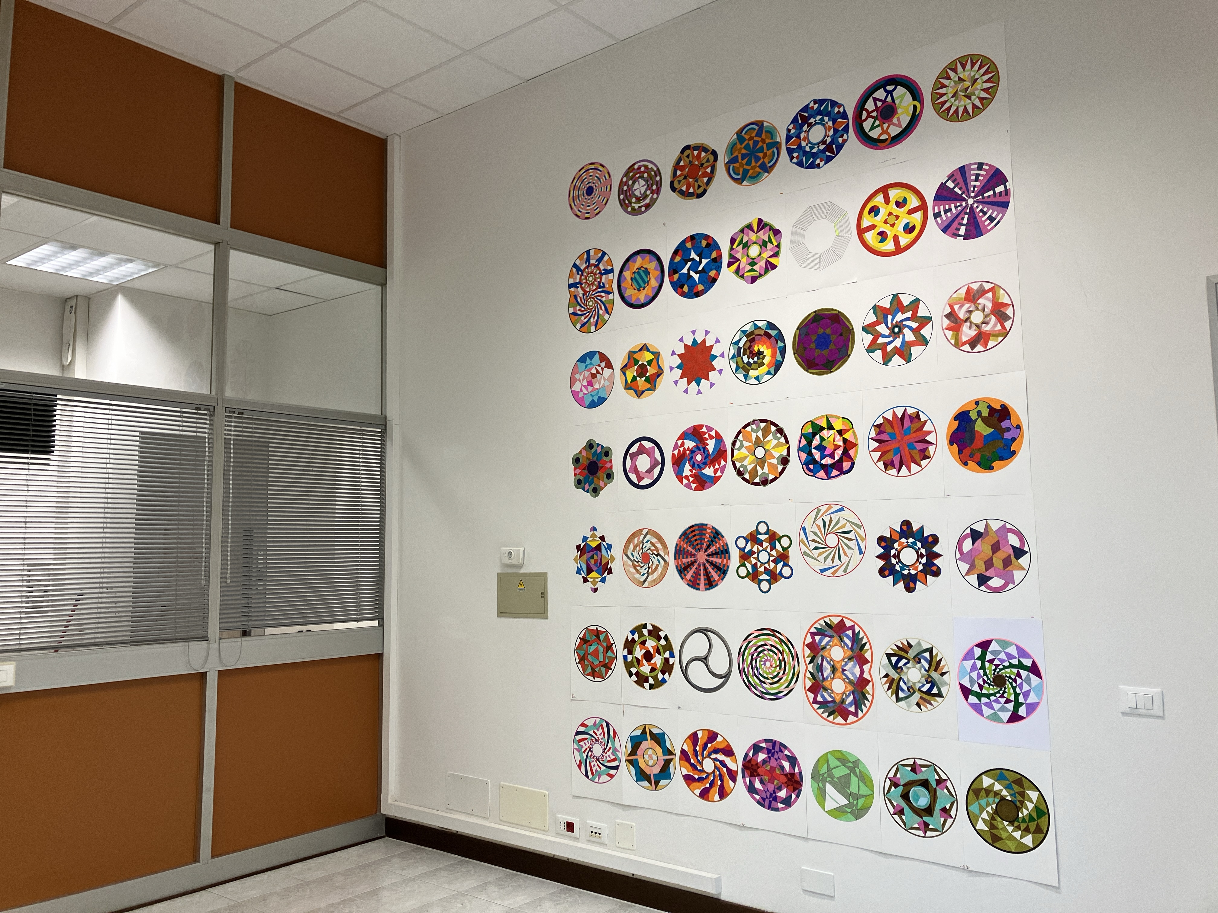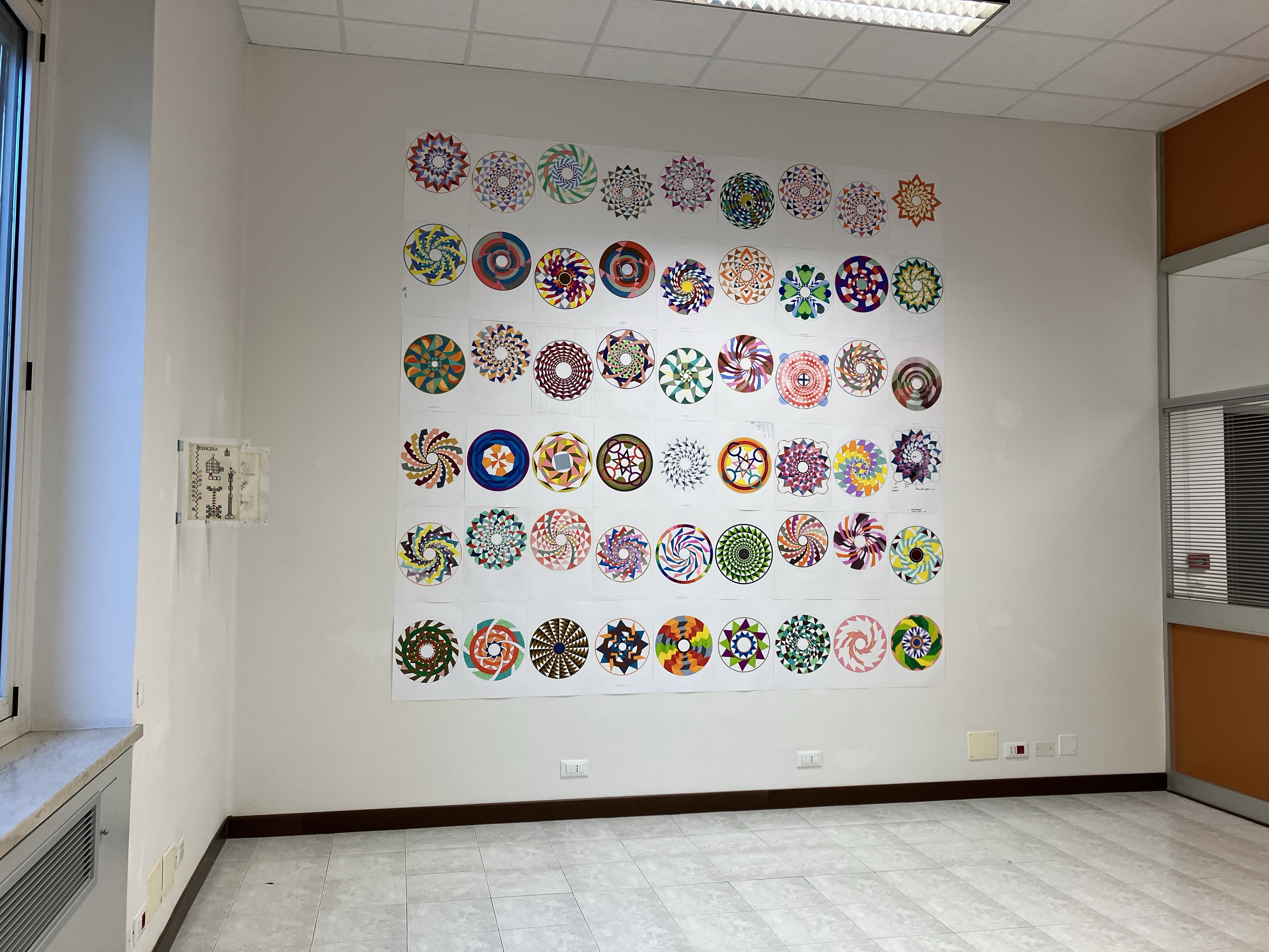 13. “54 variazioni sul motivo geometrico a girasole” china, pennarelli e matite colorate, 288×297 cm, 2023/2025