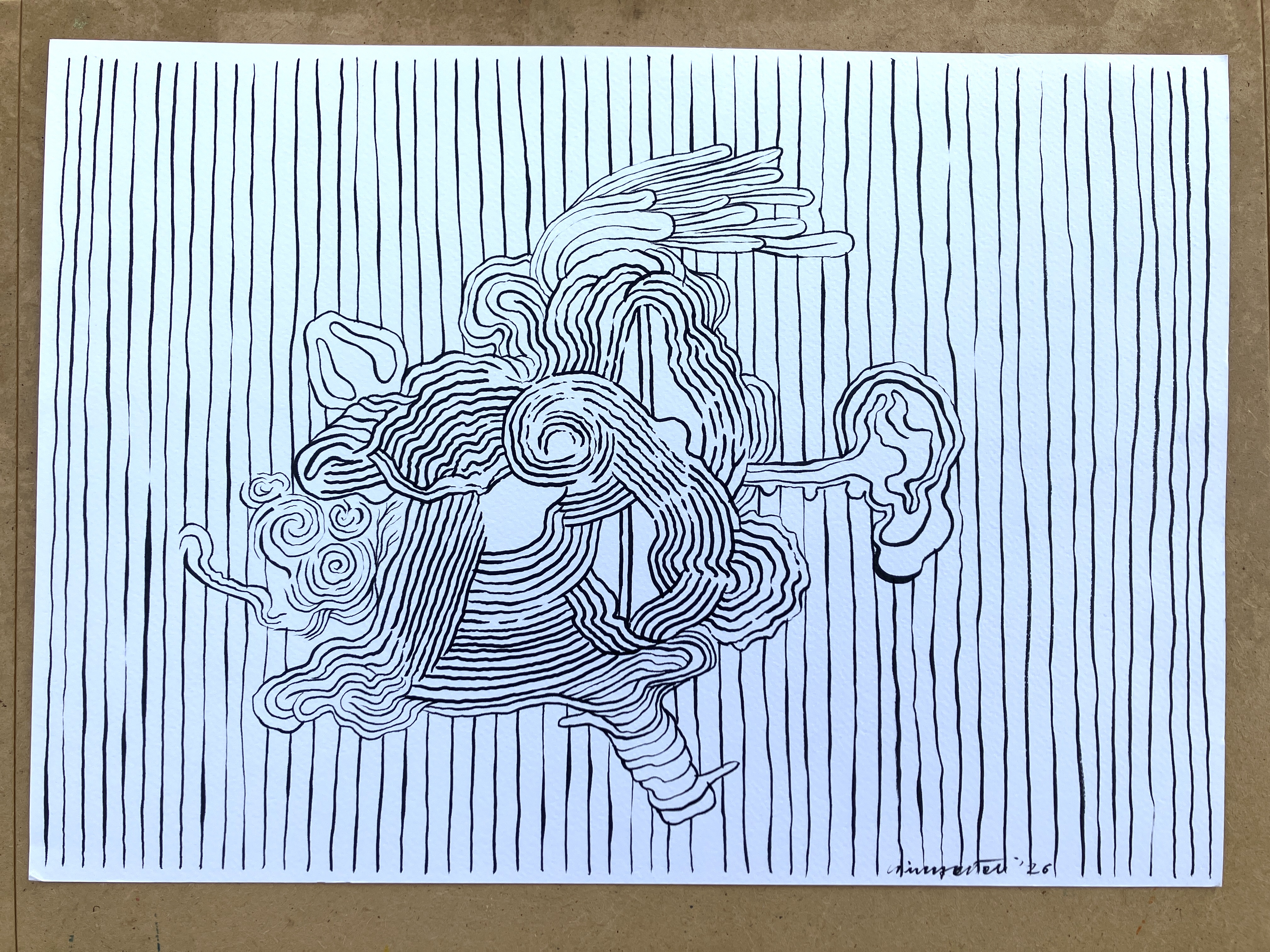 Senza titolo (uccello, agnello, naso, orecchio), china su carta ITI DUAL, 2026