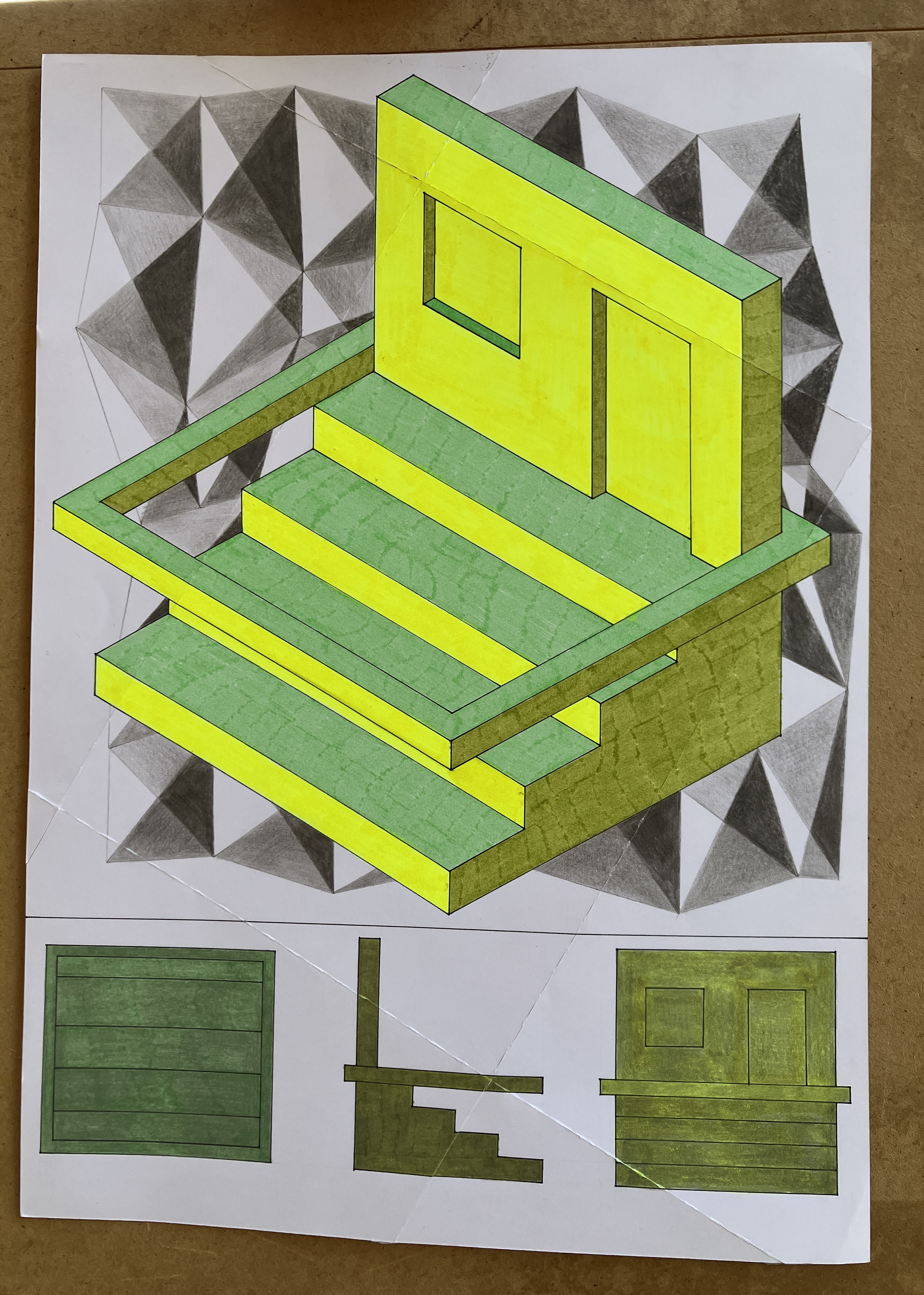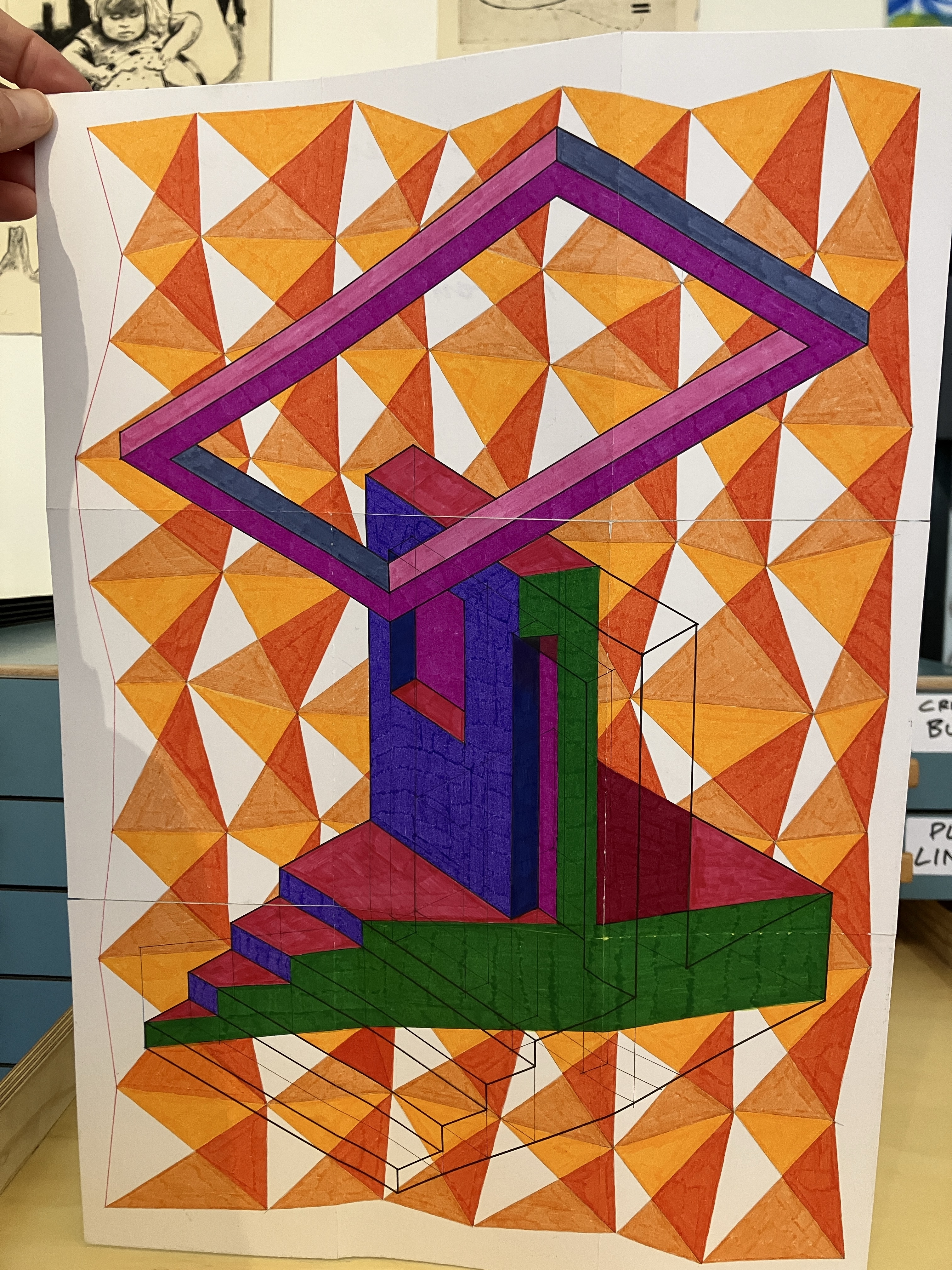14. “49 motivi geometrici” china, pennarelli e matite colorate, 294×207,9 cm, 2023/2025