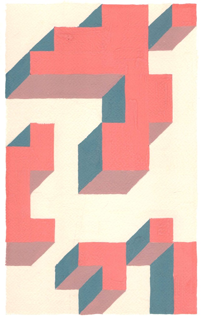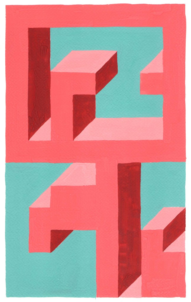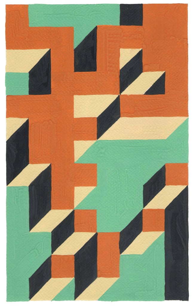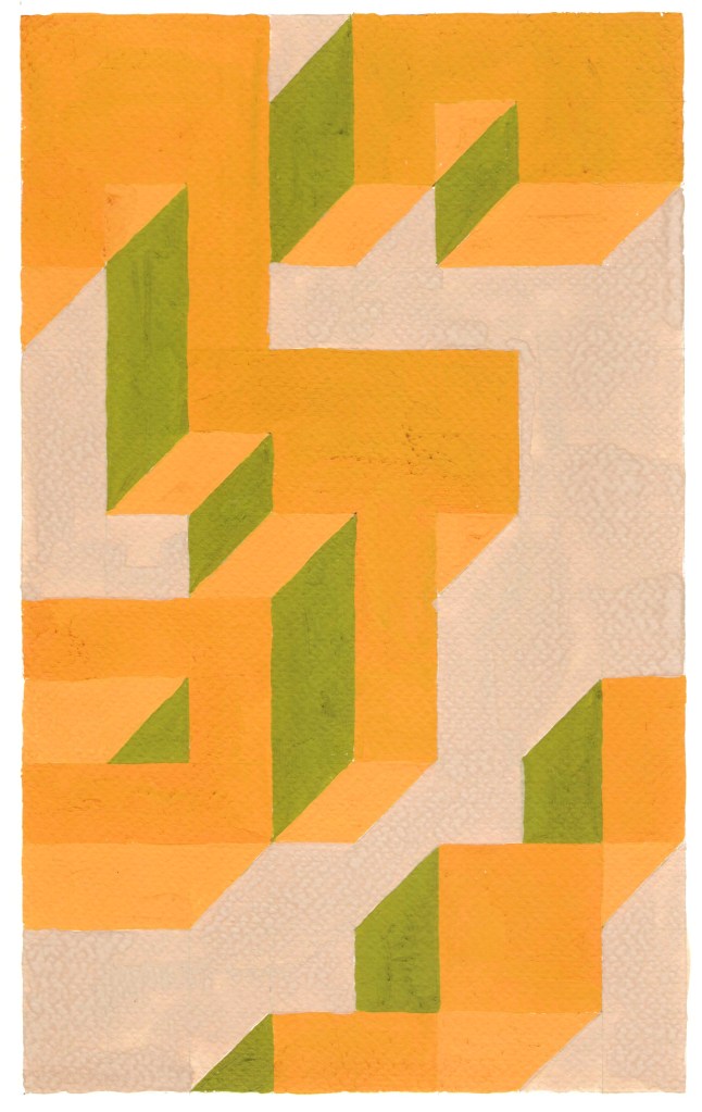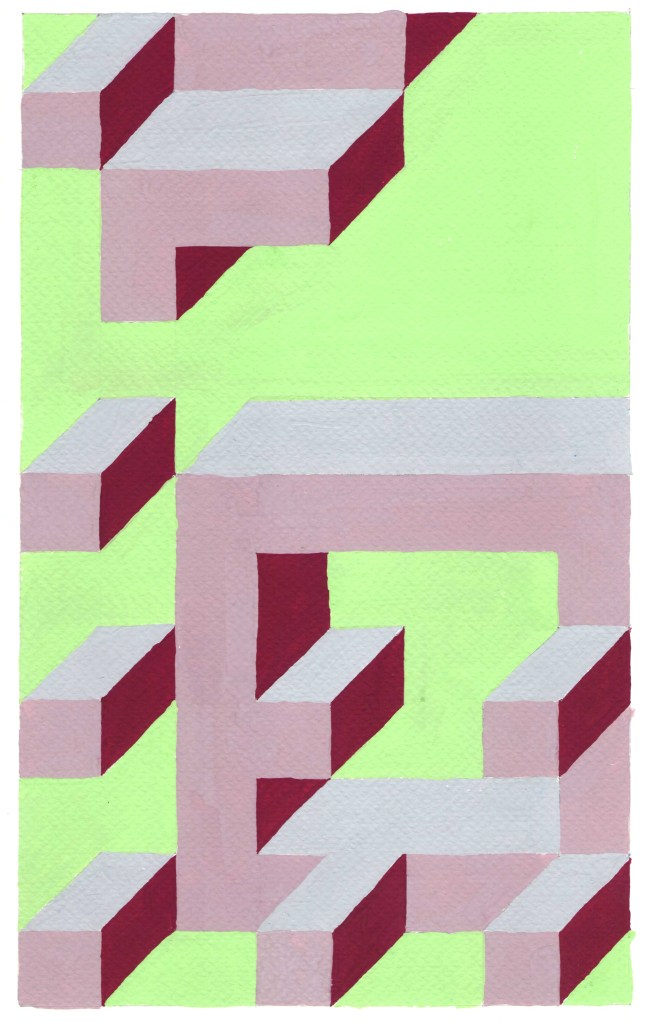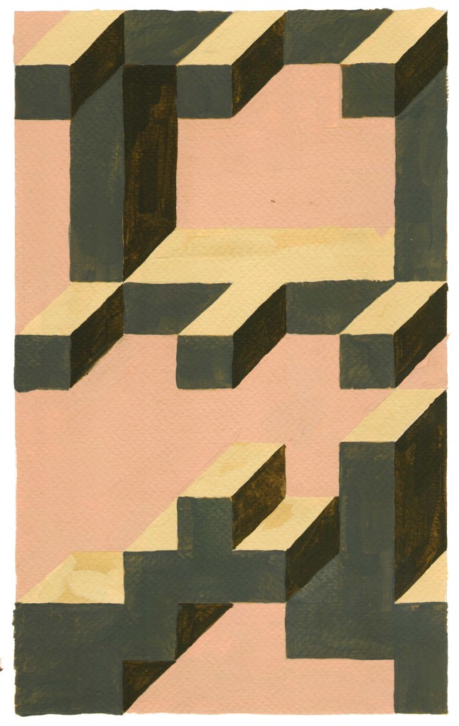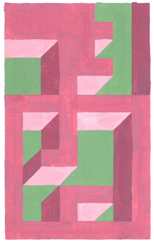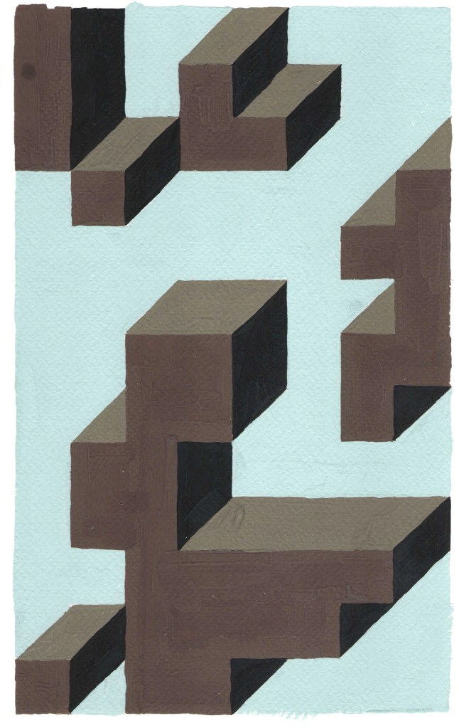 Prospettive impossibili, omaggio a Dadamaino tempere su carta, dimensioni variabili c.a. 21 x 35,5 , 2021-2023. La serie, qui riprodotta solo in parte è un esercizio si stile ispiratomi dagli omonimi dipinti monocromi di Dadamaino