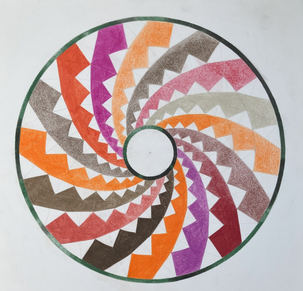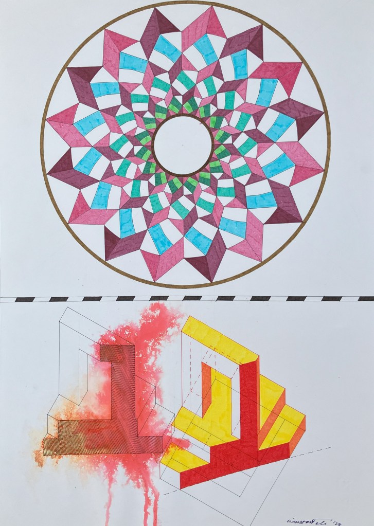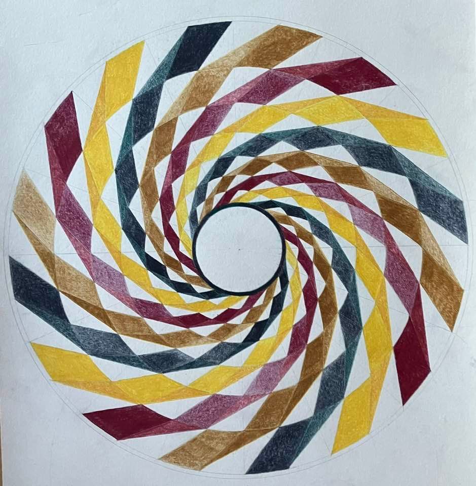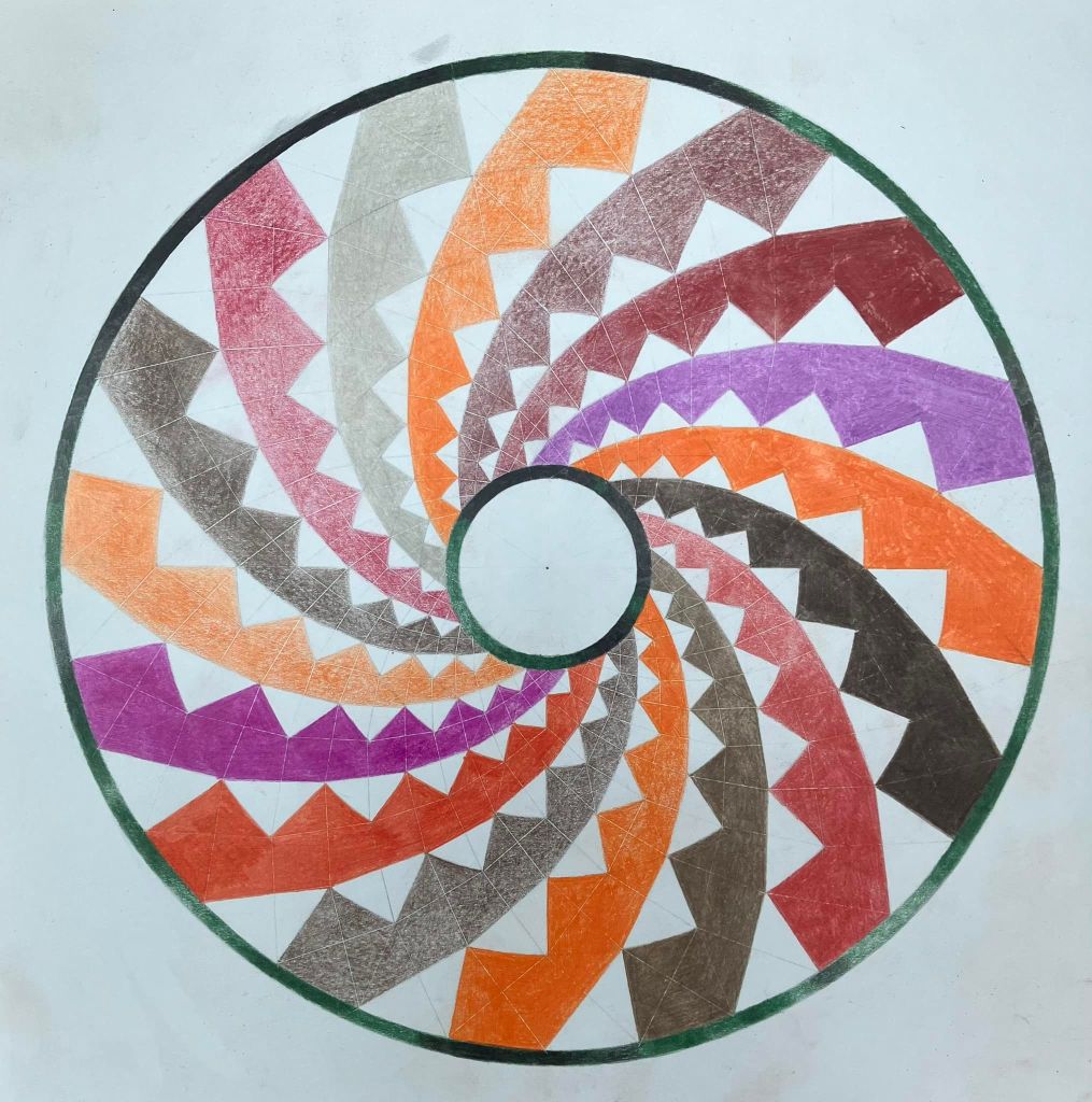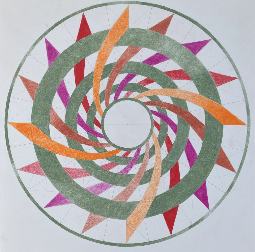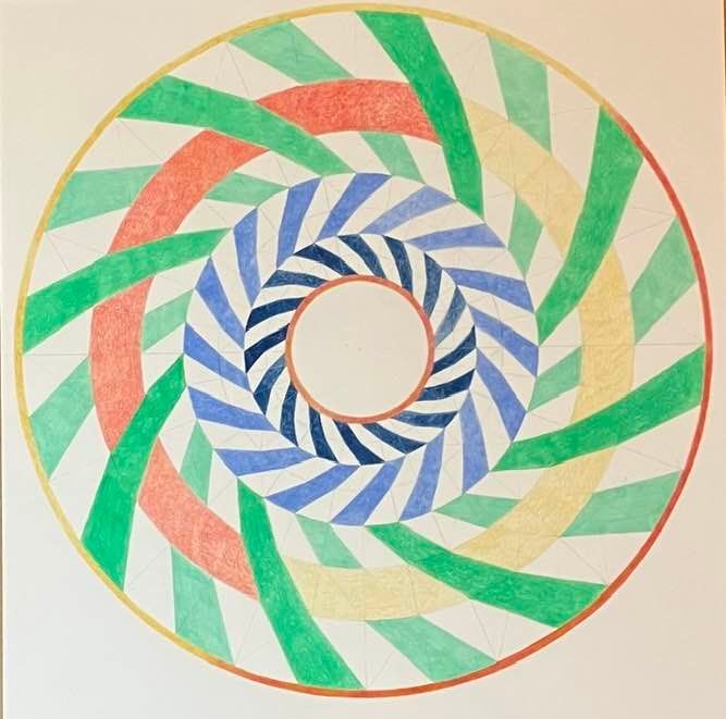 Selezione di tondi (O) 2023/2024. Ogni disegno è di raggio 16 cm c.a. impostato su una stessa struttura geometrica “a girasole”. I colori sono dati con le matite colorate. Si tratta di un esercizio combinatorio, alla ricerca di un modulo decorativo “interessante”, molto stimolante e distensivo (almeno per chi lo fa).