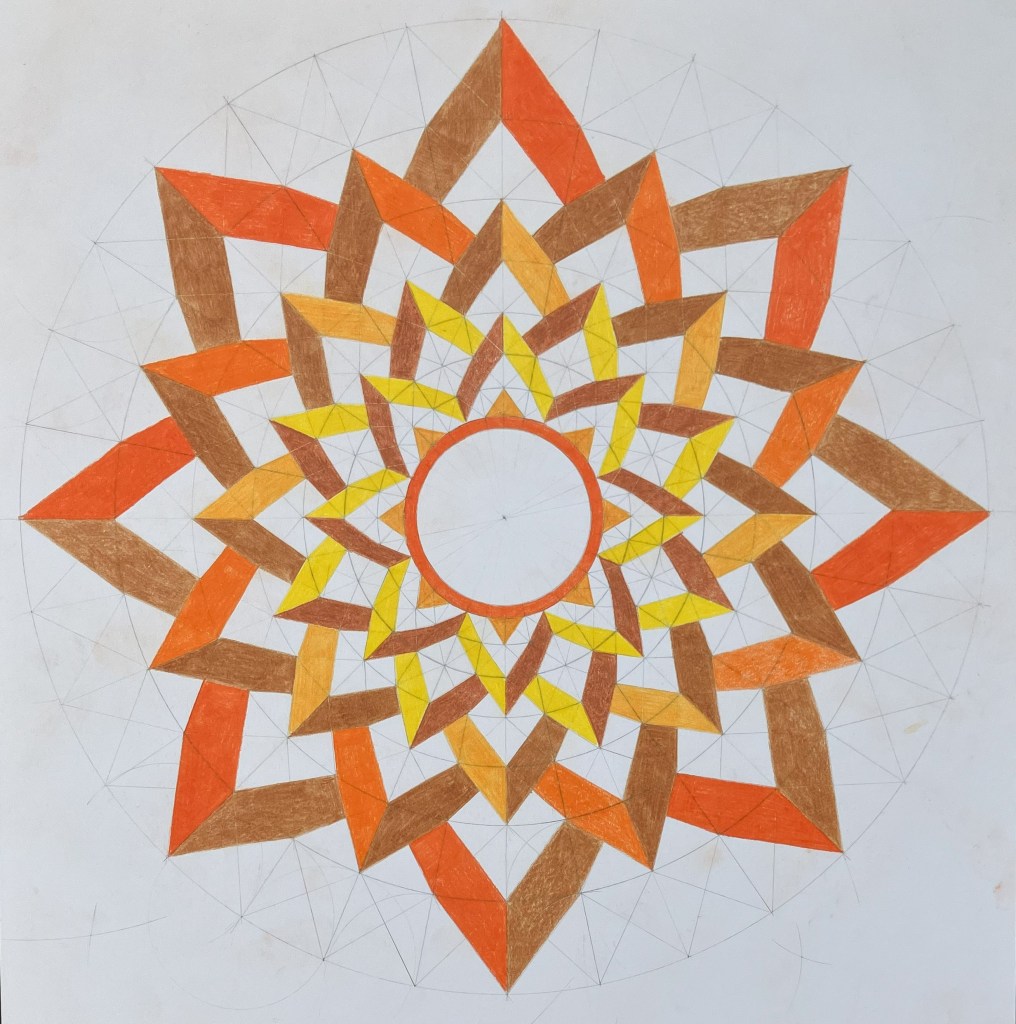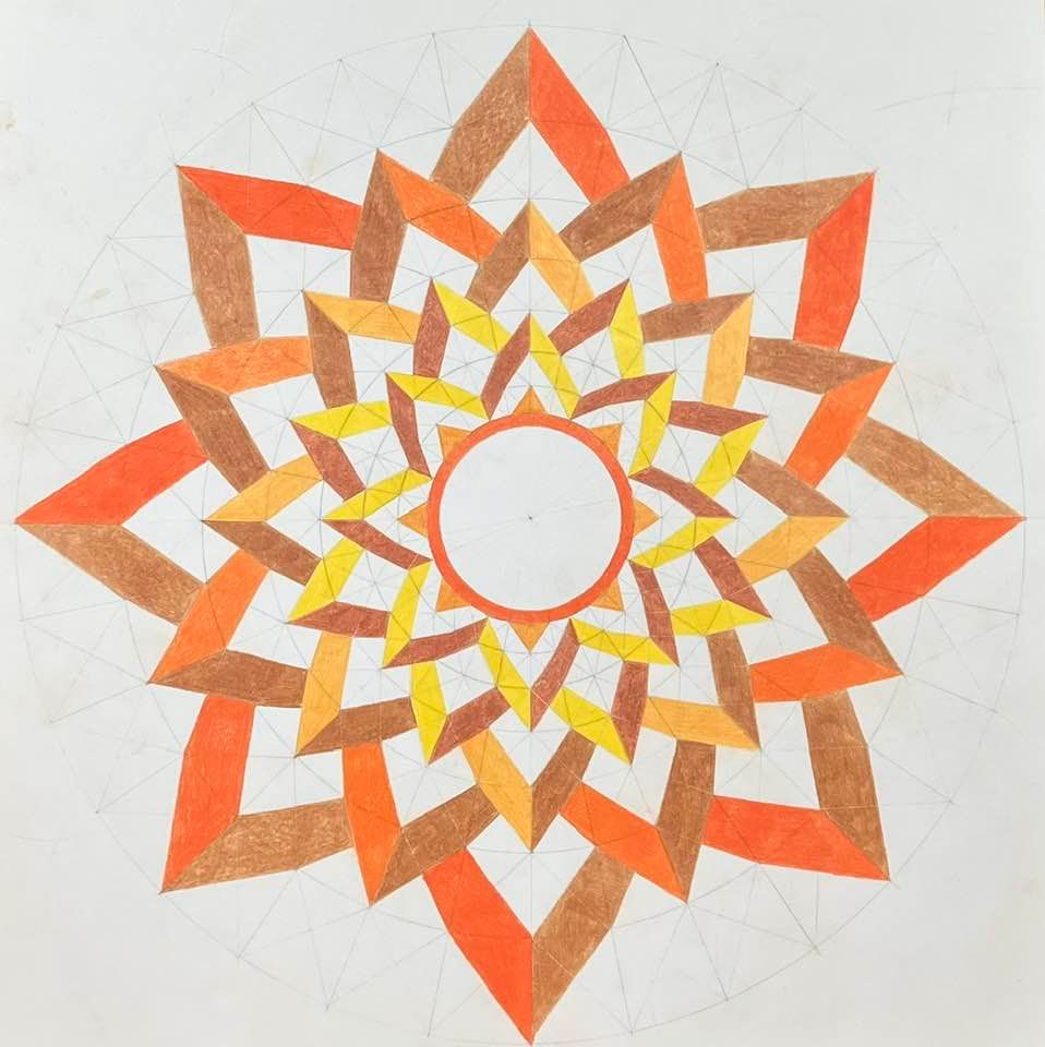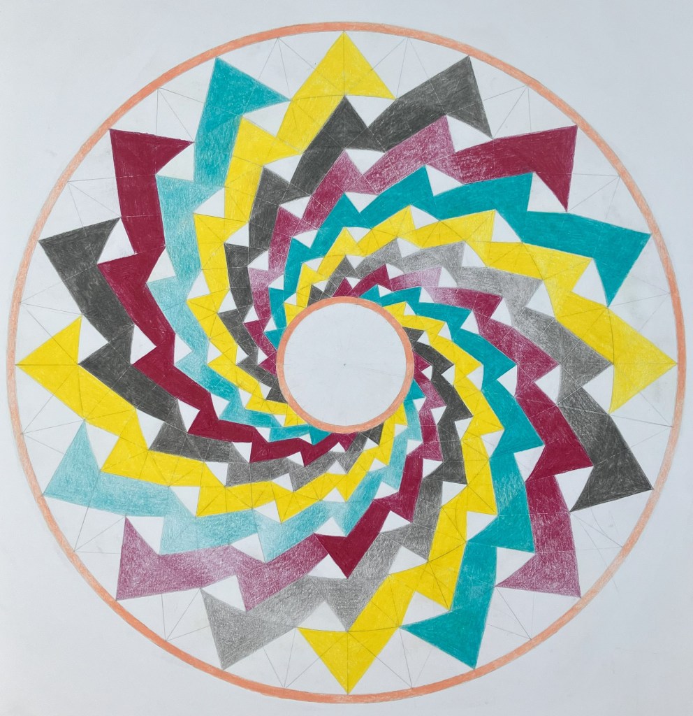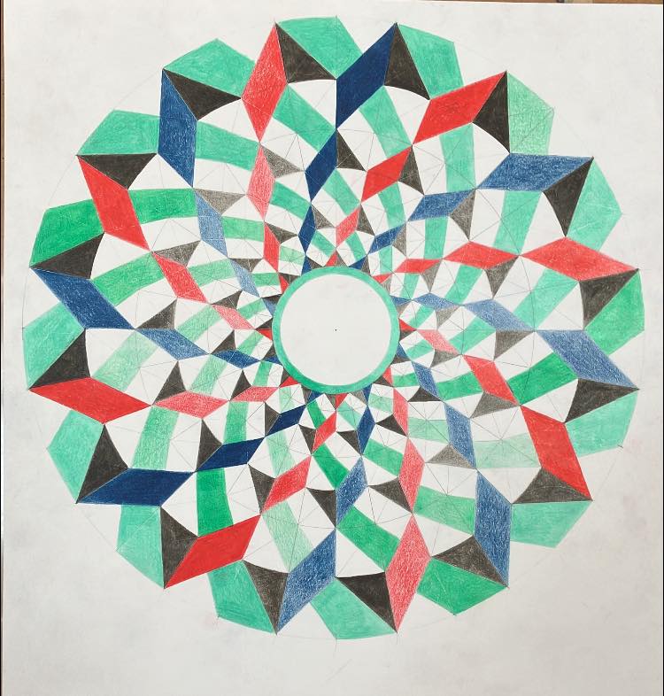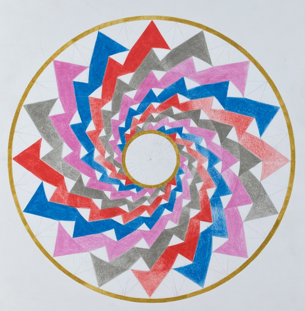 Selezione di tondi (O) 2023/2024. Ogni disegno è di raggio 16 cm c.a. impostato su una stessa struttura geometrica “a girasole”. I colori sono dati con le matite colorate. Si tratta di un esercizio combinatorio, alla ricerca di un modulo decorativo “interessante”, molto stimolante e distensivo (almeno per chi lo fa).