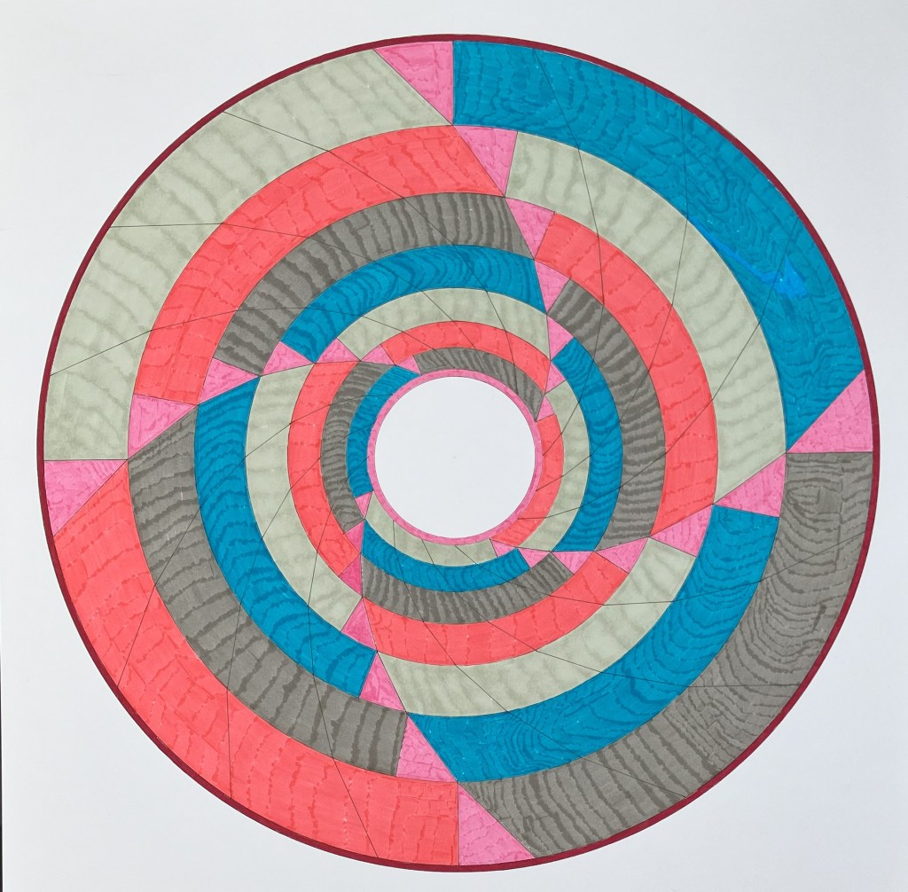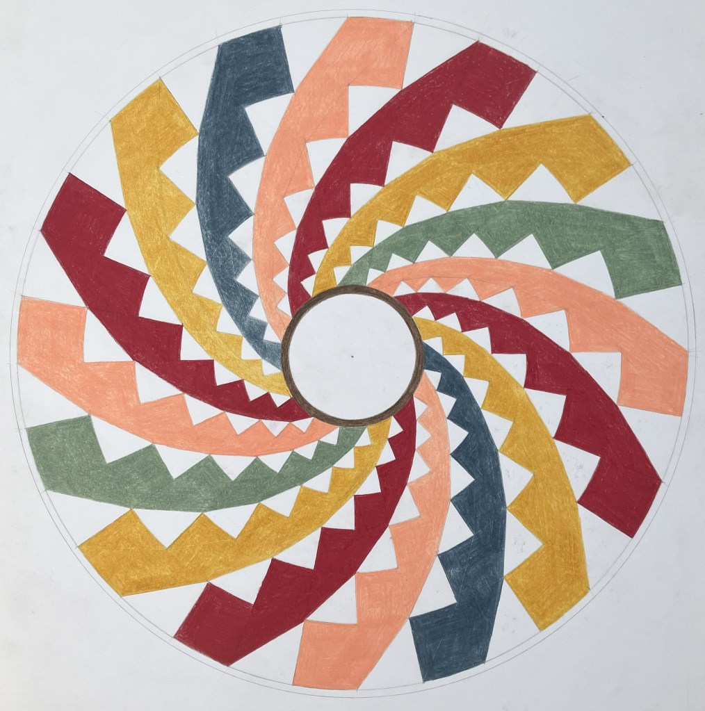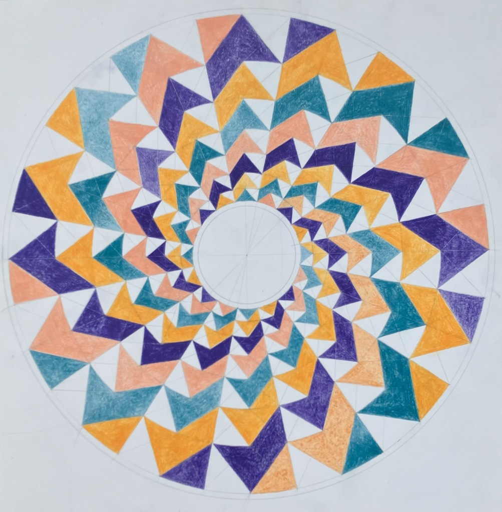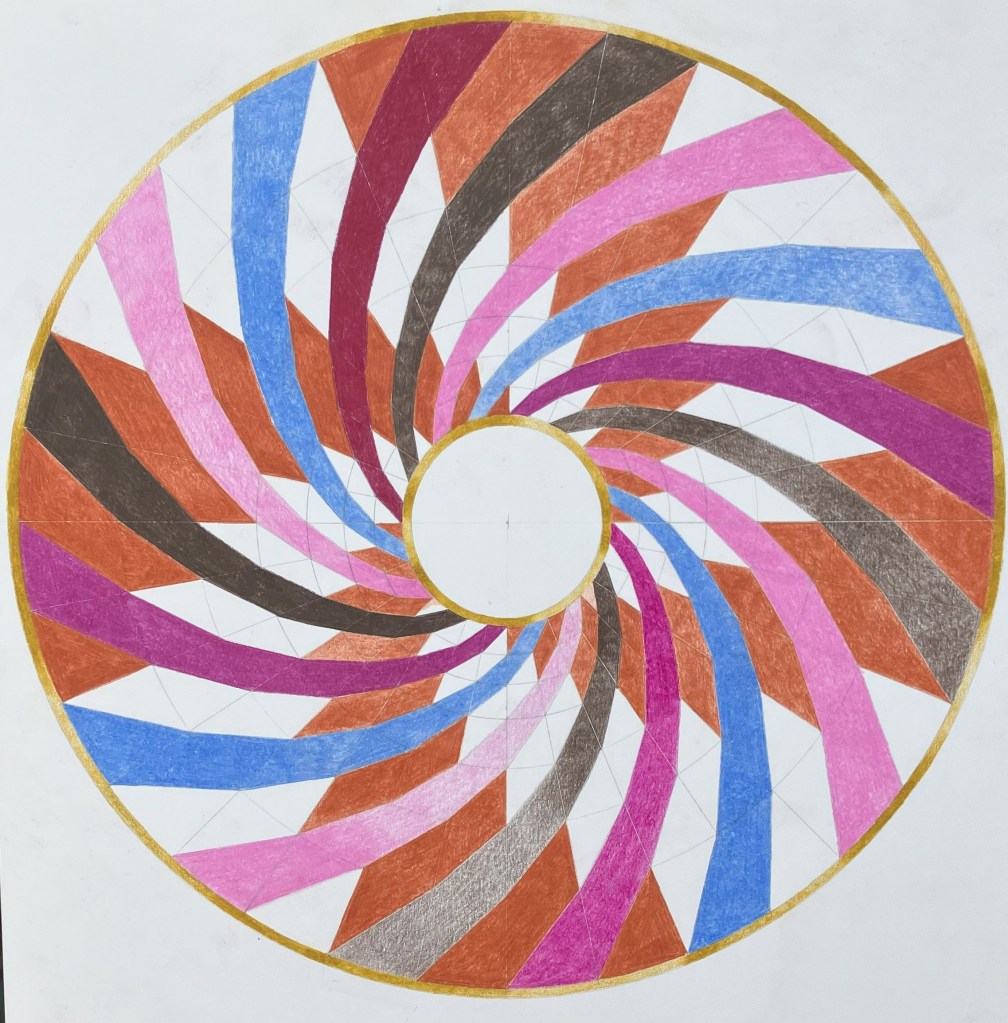 Selezione di tondi (O) 2023/2024. Ogni disegno è di raggio 16 cm c.a. impostato su una stessa struttura geometrica “a girasole”. I colori sono dati con le matite colorate. Si tratta di un esercizio combinatorio, alla ricerca di un modulo decorativo “interessante”, molto stimolante e distensivo (almeno per chi lo fa).