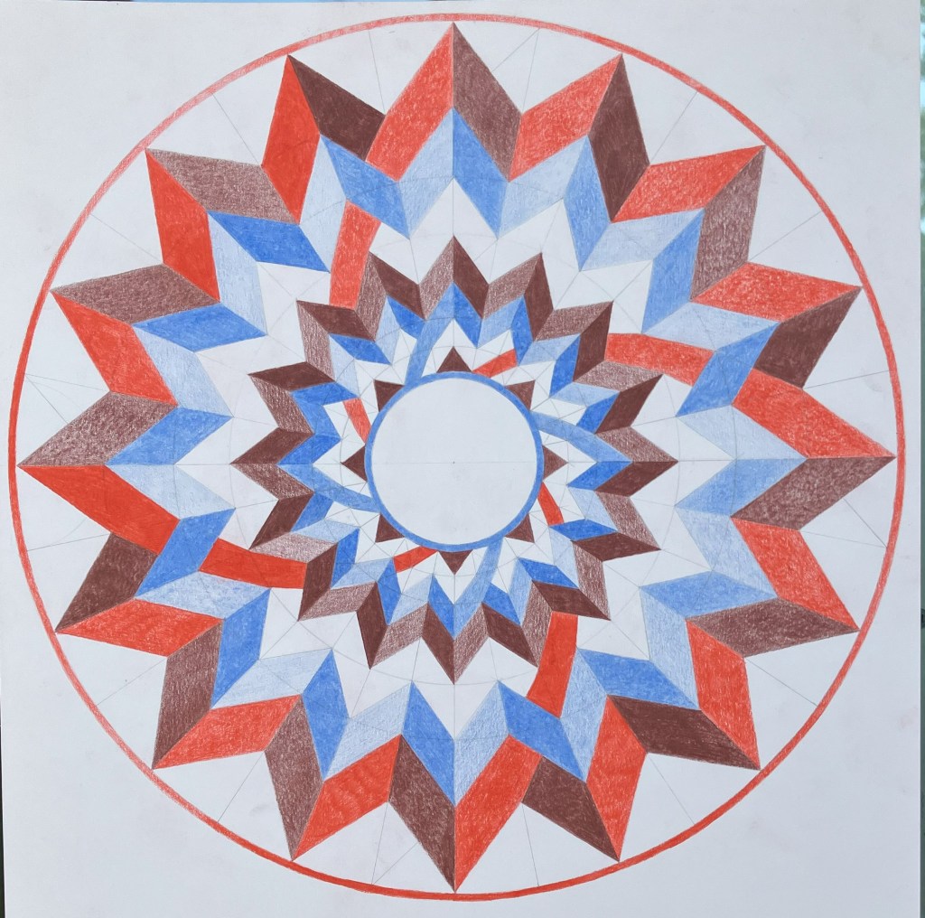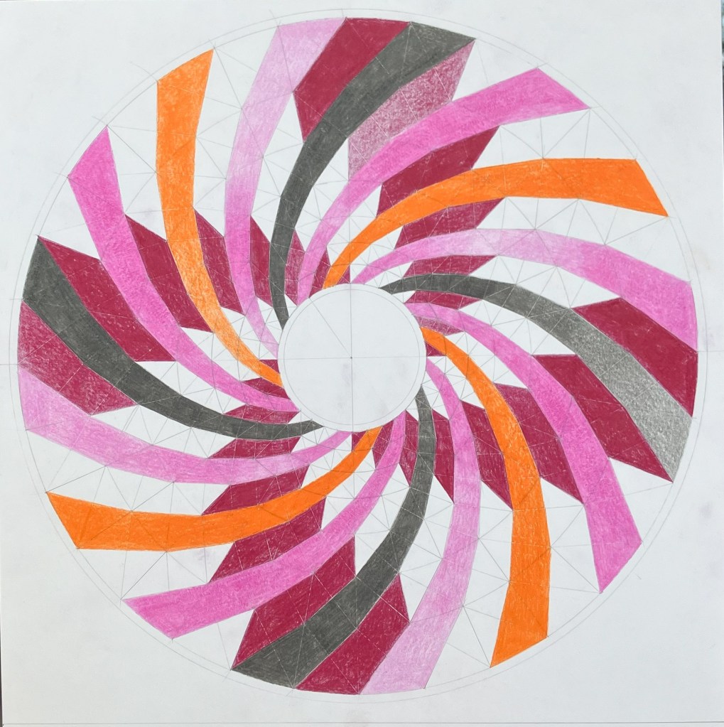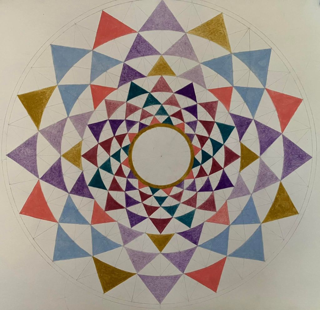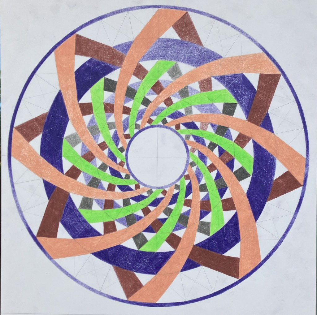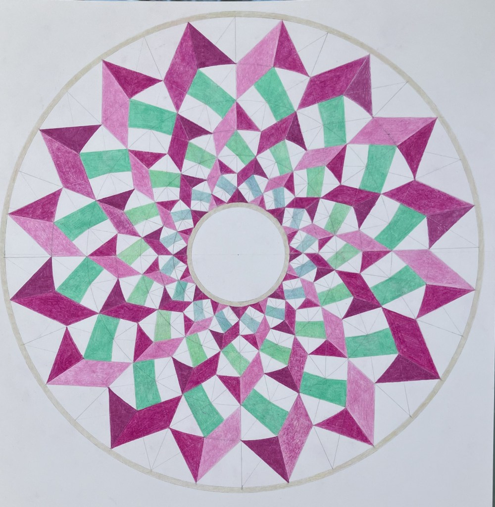 Selezione di tondi (O) 2023/2024. Ogni disegno è di raggio 16 cm c.a. impostato su una stessa struttura geometrica “a girasole”. I colori sono dati con le matite colorate. Si tratta di un esercizio combinatorio, alla ricerca di un modulo decorativo “interessante”, molto stimolante e distensivo (almeno per chi lo fa).