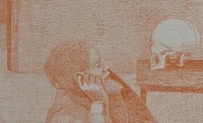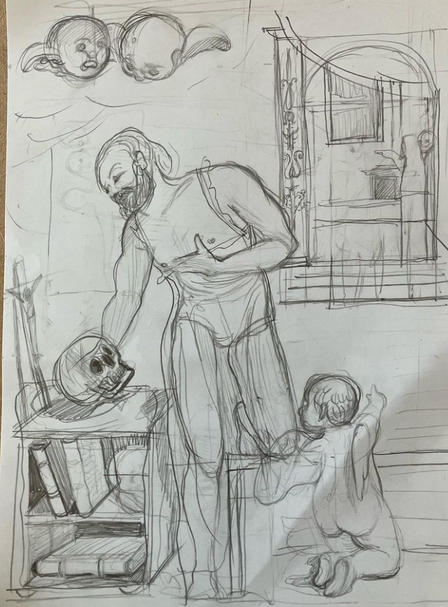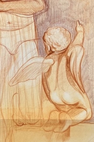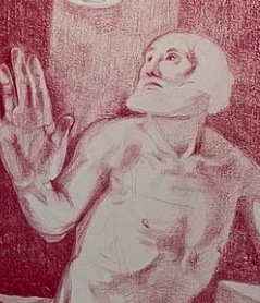 Non trovando tra le storie del Pronti e, per quanto ne so, nemmeno in altri pittori, l’episodio del santo in vesti muliebri, tradito dai confratelli e per questo deciso a farsi eremita, ho provato ad immaginarlo. I nuovi episodi che ho disegnato non rispettano tutti l’obiettivo iniziale ma sicuramente insistono su alcuni topoi dell’arte barocca: putti volanti, abbondanza di panneggi, pose ardite. Girolamo giovane dal corpo sinuoso di dio greco assorto guarda davanti a sé mentre un putto gli mostra la croce quale monito a una vita di castità; un vecchio Girolamo nudo ed emaciato, ormai eremita, a cui appare da una finestra spazio-temporale, ovale come un cammeo, il musicista giamaicano Desmond Dekker! I disegni sono monocromi per rispettare il modello di riferimento (Pronti) ma variando i toni del rosso dal magenta più violaceo all’arancio.