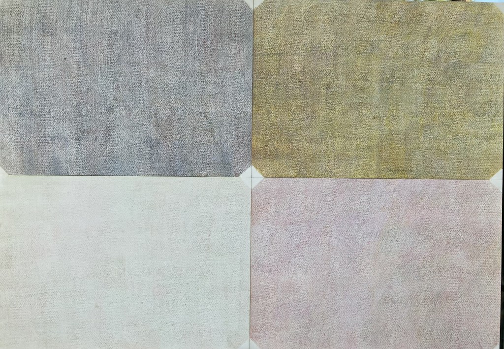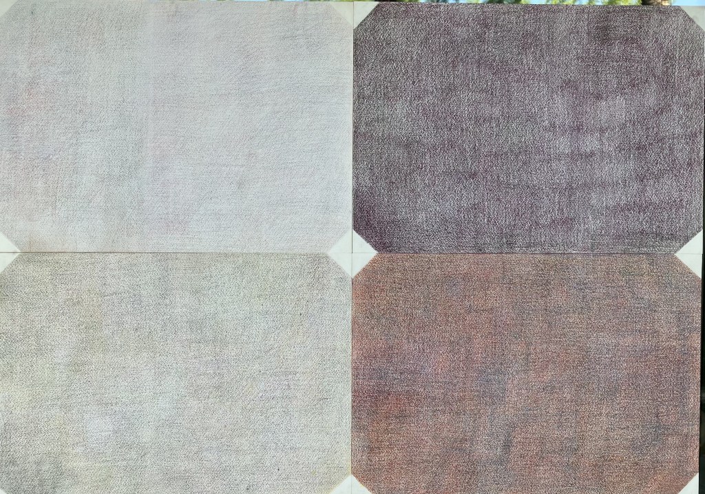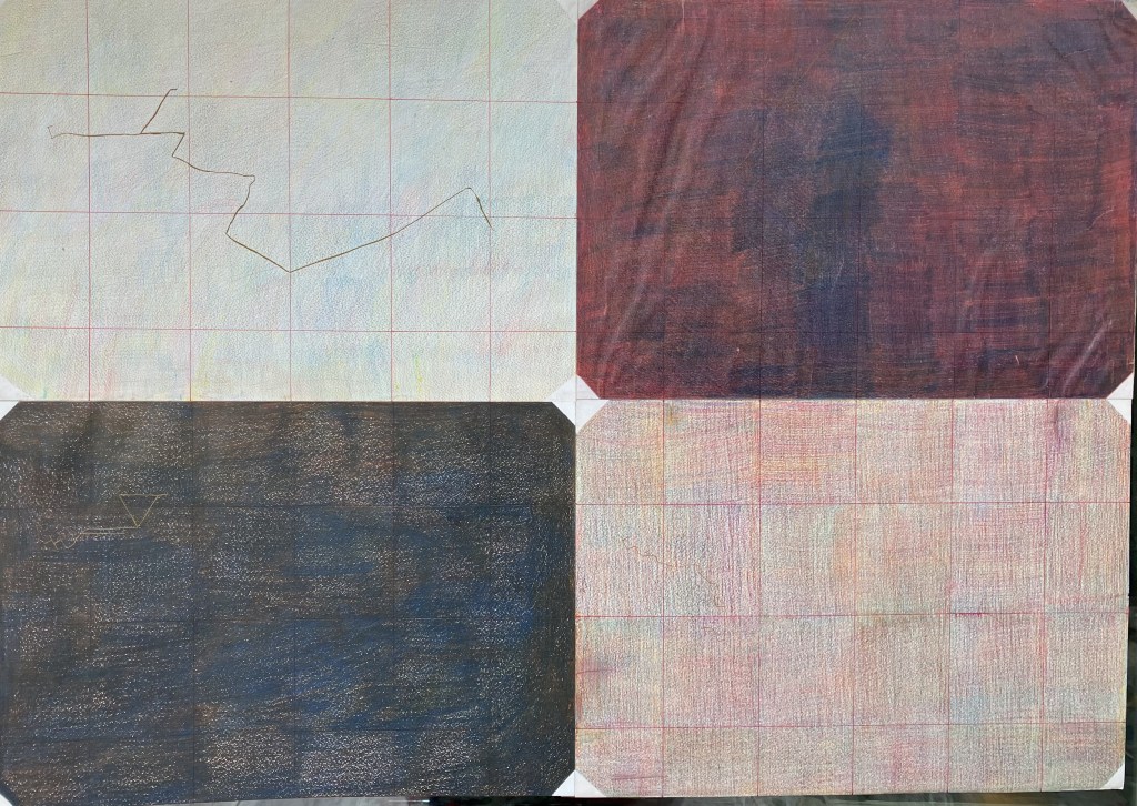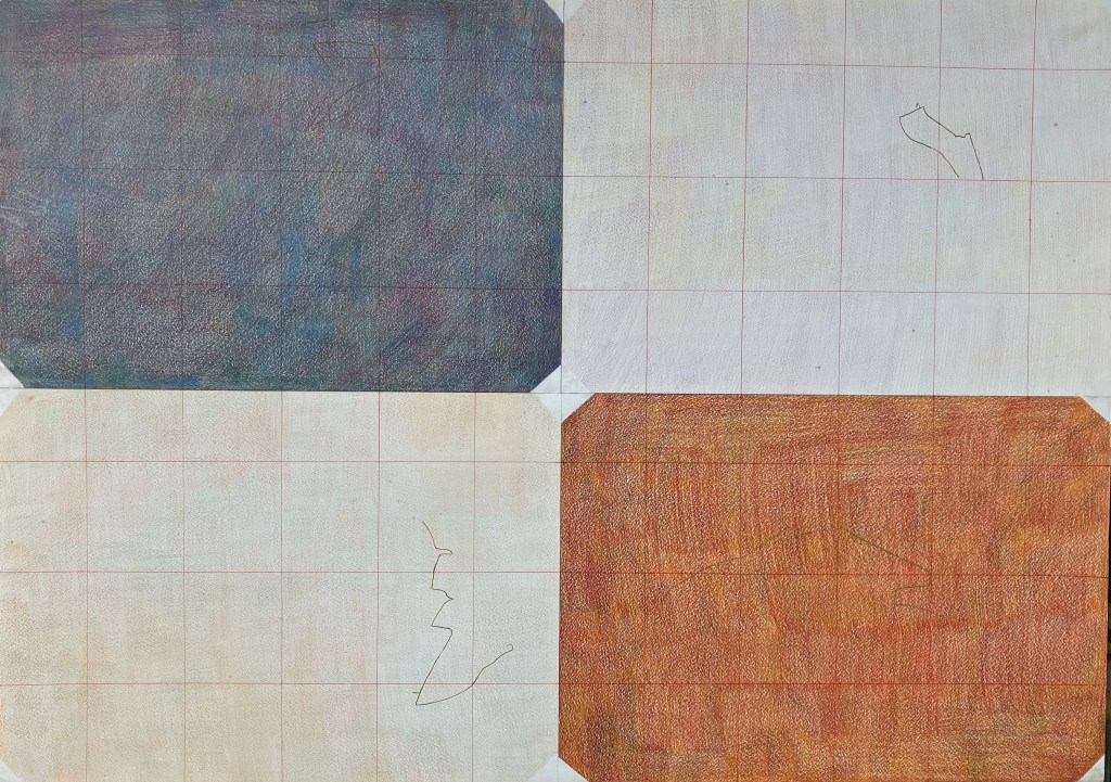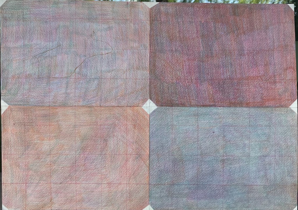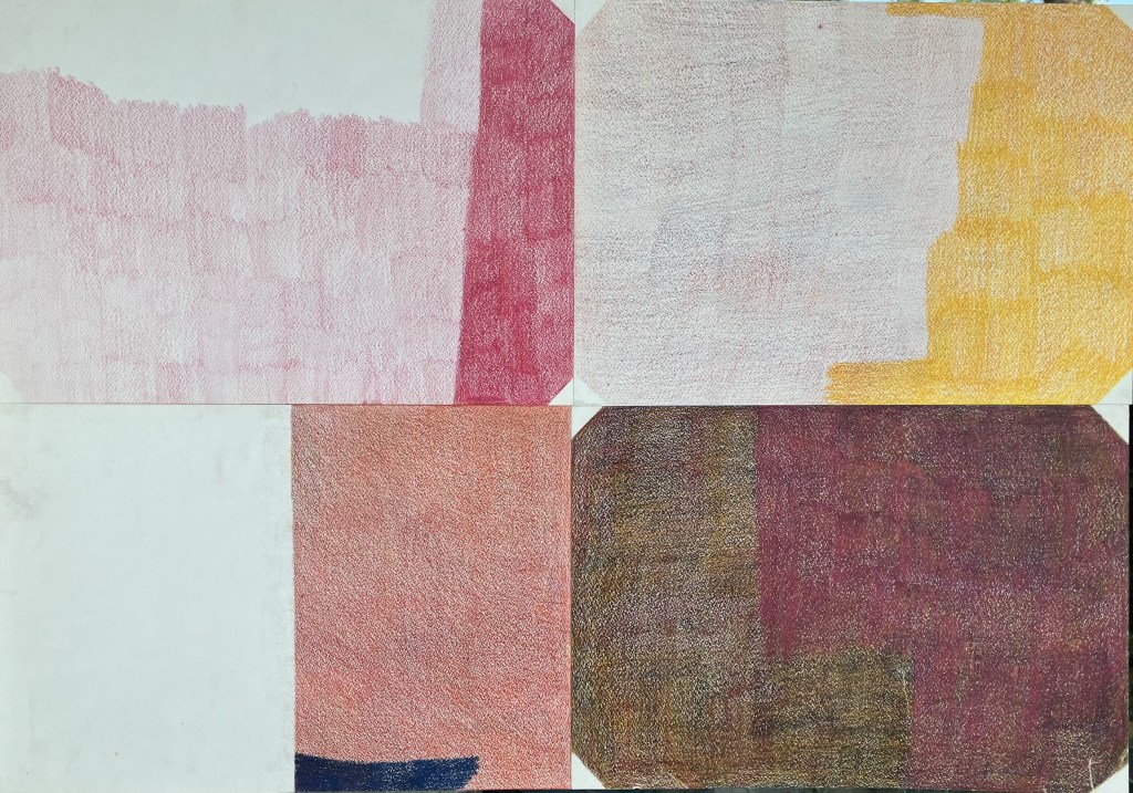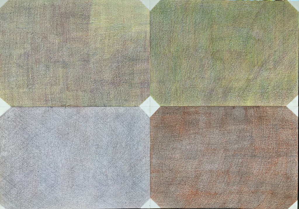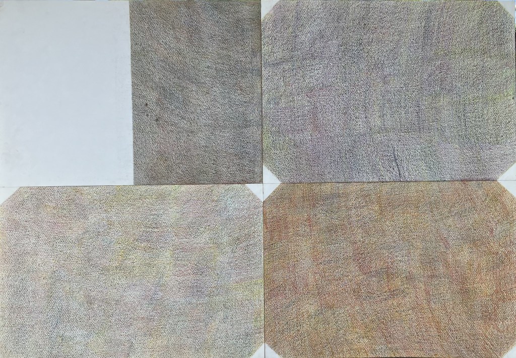 La serie nasce dall’ascolto di una famosa opera di Luigi Einaudi. Anche la serie “Rosaspinto” nasceva da una suggestione musicale1. Ogni disegno è composto da quattro fogli 33 x 48 cm semi-ruvidi incollati assieme sul retro. La disposizione è orizzontale. Il colore è steso sovrapponendo strati di colori complementari. A seconda della tinta dominante e della minore o maggiore pressione della mano ottengo una gamma di colori neutri innominabili. L’effetto è simile allo “snow” o “white noise” dello schermo TV.